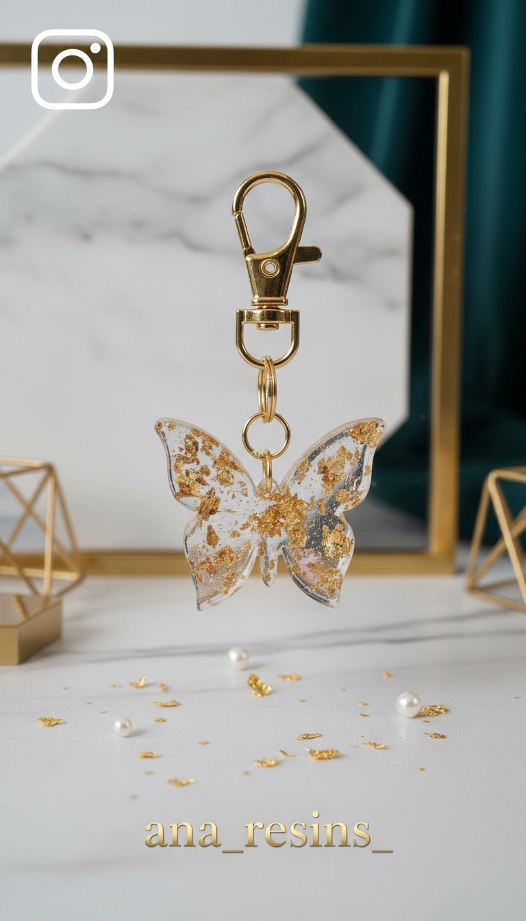 En elegant handgjord fjärilsnyckelring i transparent resin, dekorerad med skimrande guldfoliedetaljer som reflekterar ljuset med sofistikerad glans.