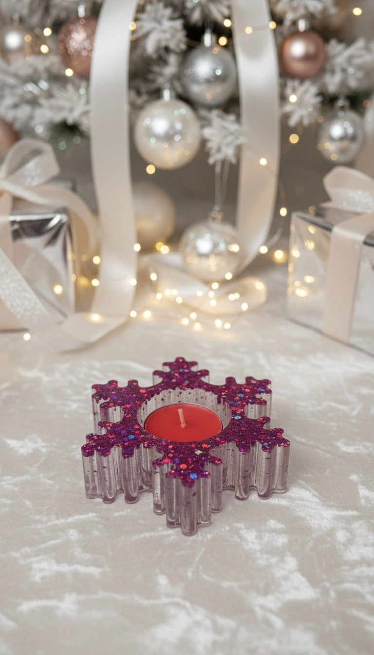 Unik handgjord ljushållare för värmeljus formad som en glittrande snöflinga. Perfekt som en elegant och personlig inredningsdetalj.
