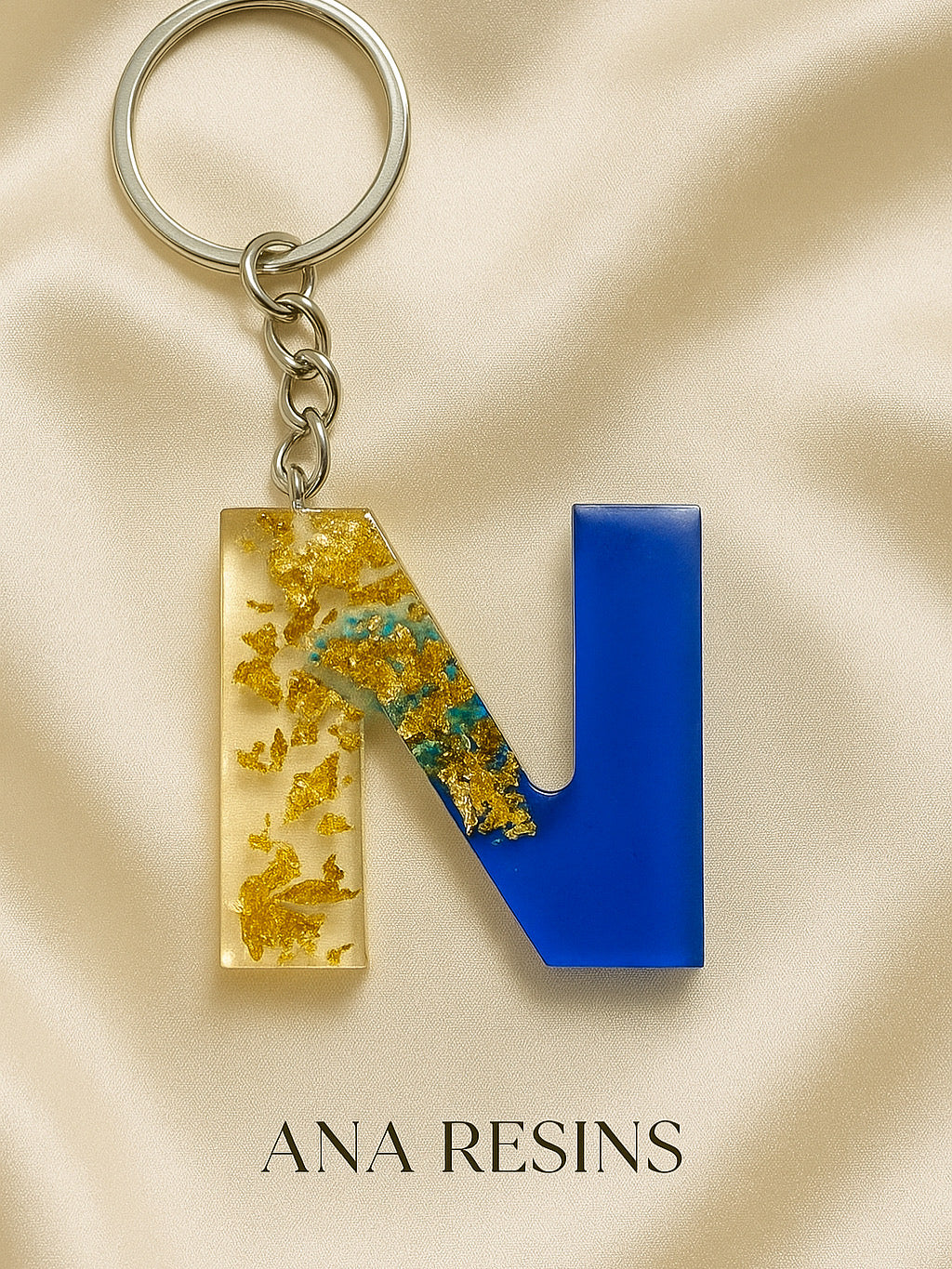 Nyckelring i resin, handgjord med blå och guldfärgade detaljer för unik design