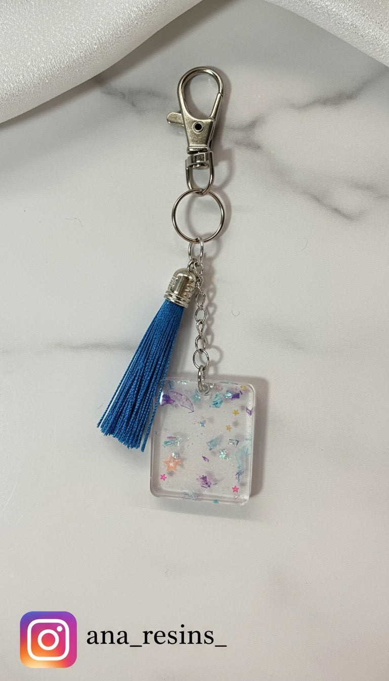 Denna handgjorda nyckelring är tillverkad i kristallklar resin och dekorerad med små stjärnor samt färgglada flakes som ger ett unikt och lekfullt utseende. Nyckelringen pryds dessutom av en elegant blå tofs, vilket gör den till en stilfull accessoar för både nycklar och väskor.