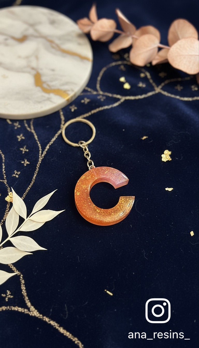 Nyckelring i resin, handgjord, rosa och orangeskimmrande med guldfärgade detaljer för unik design
