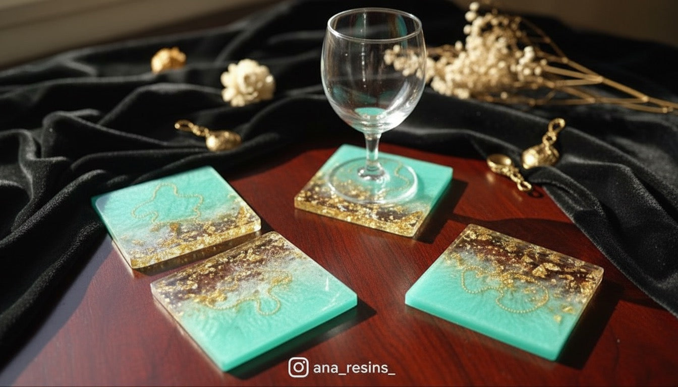 Handgjord set av 4 glasunderlägg i ljus design med guldinlägg