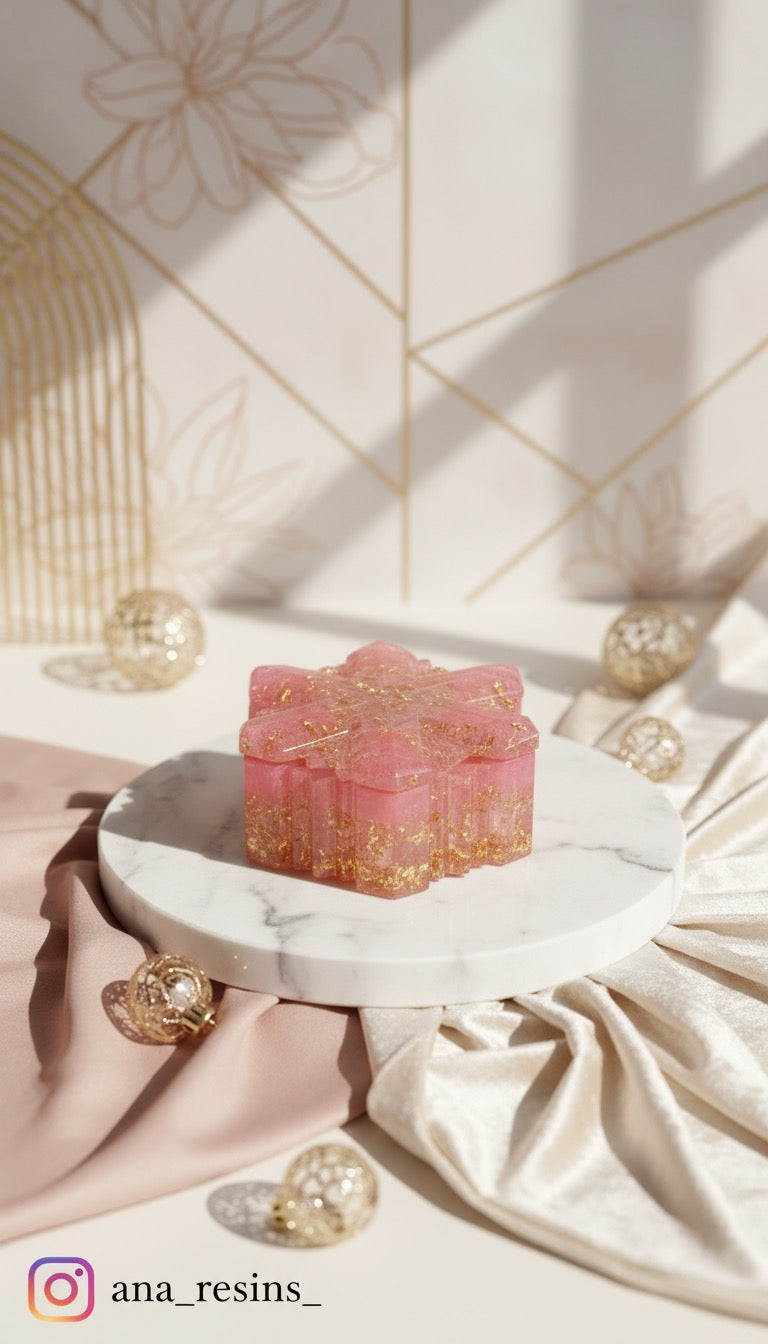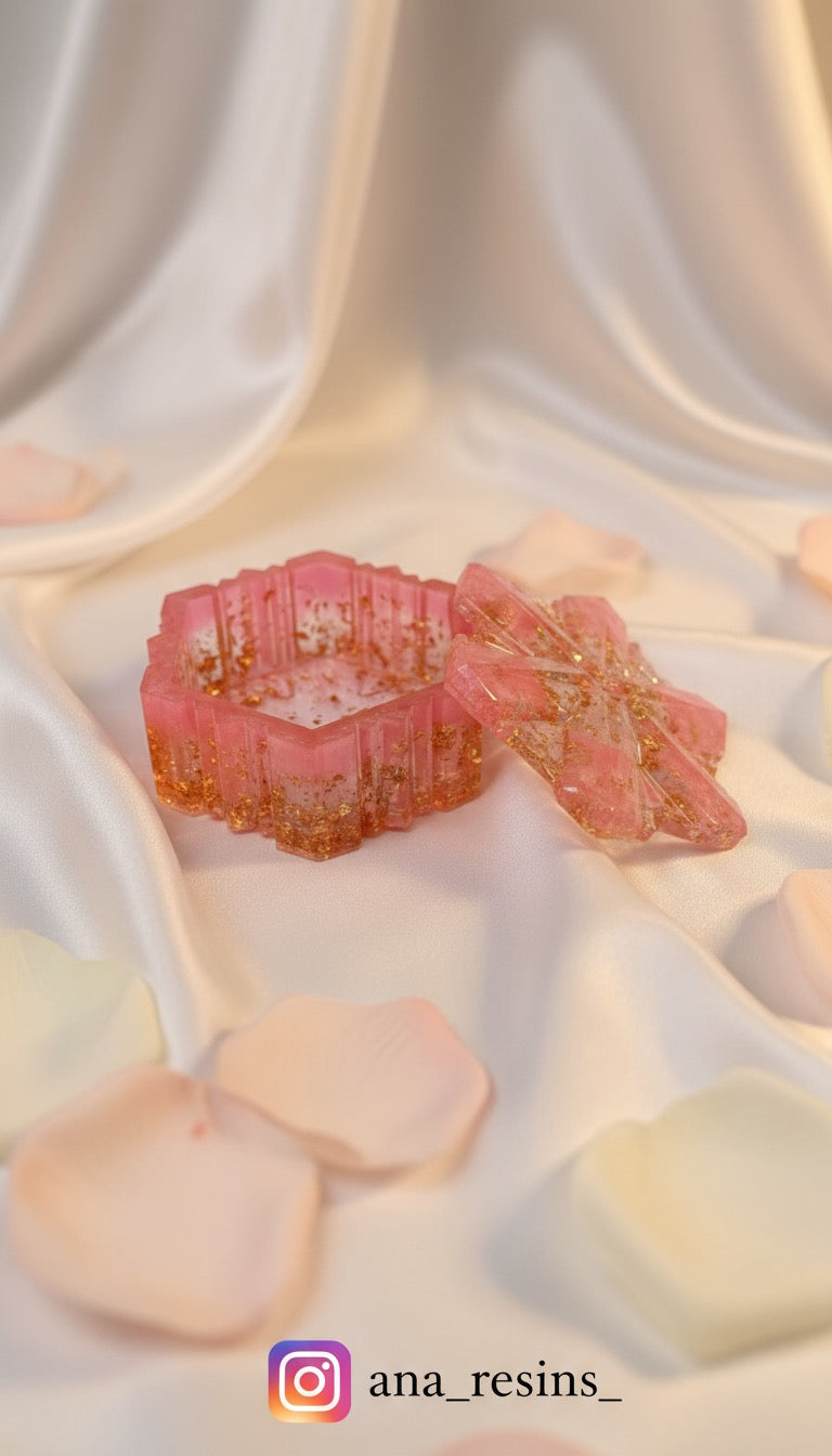 Unik handgjord resinask med gnistrande rosa och guldflingor för en elegant och sofistikerad touch. Perfekt för att förvara dina smycken eller små skatter med stil.