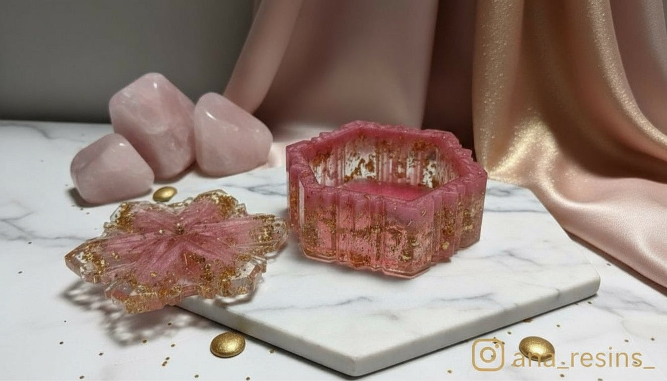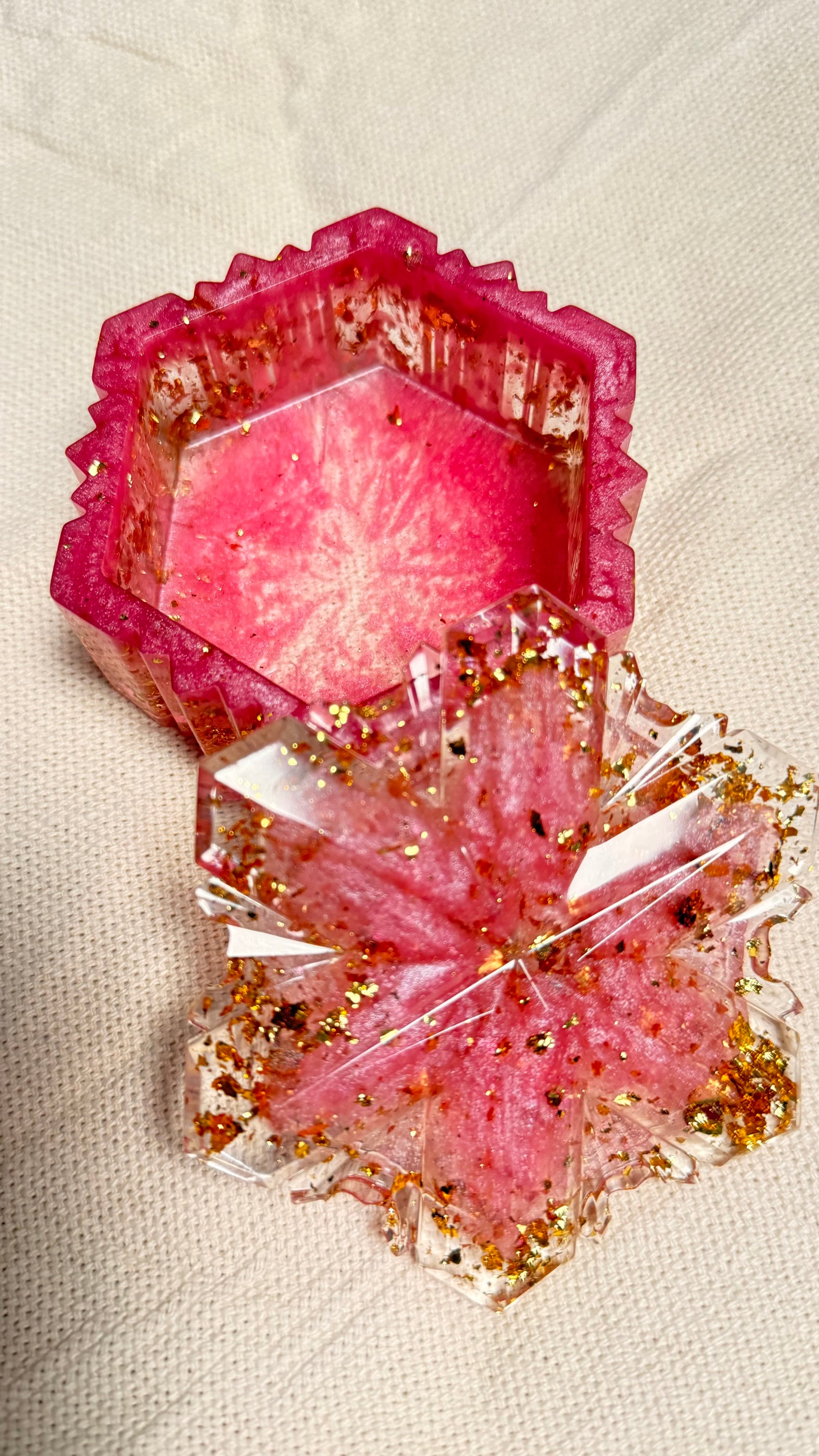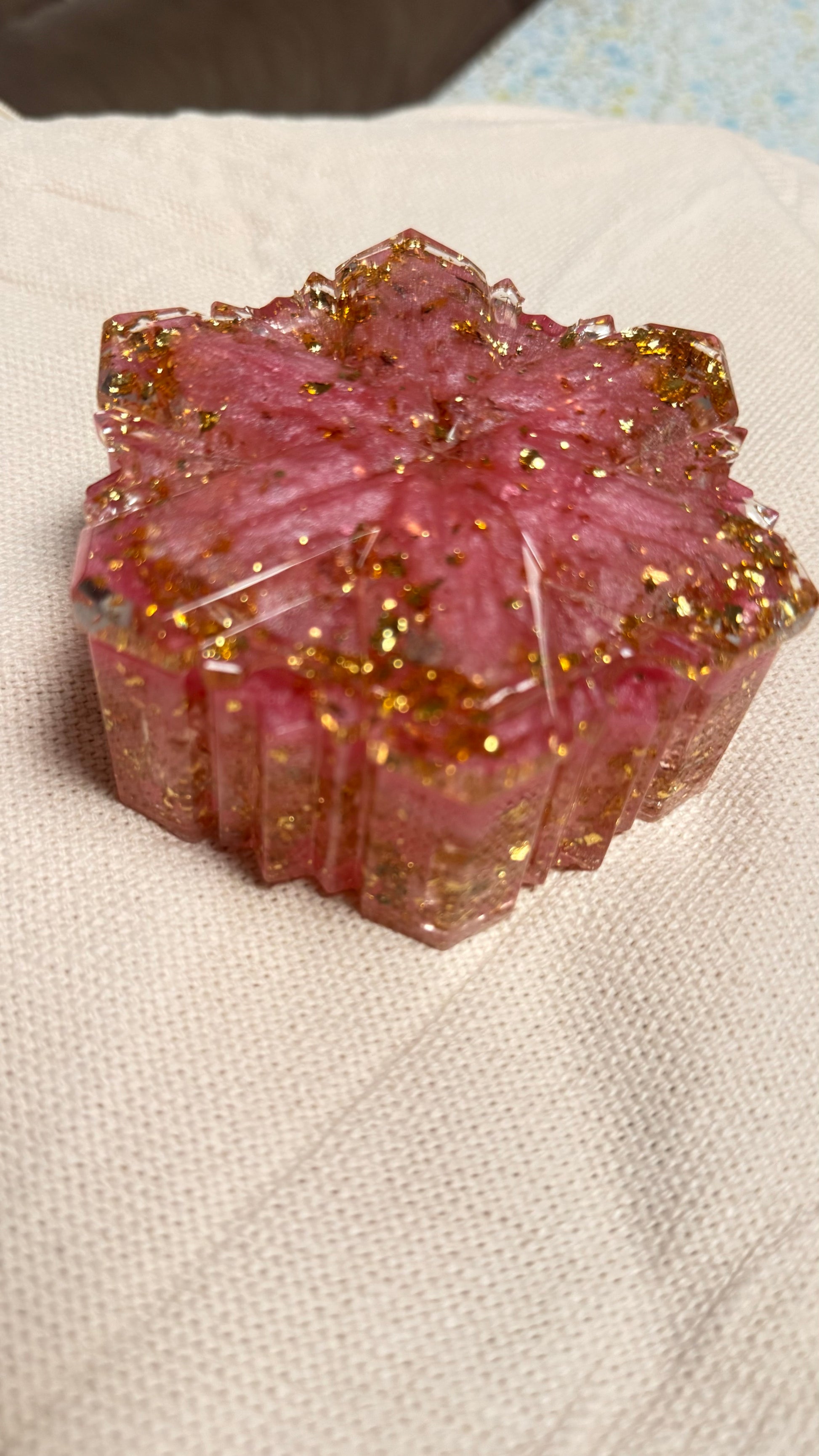 Upptäck vår handgjorda smyckesask – perfekt för dig som söker unik design och vacker förvaring av dina favoritsmycken. Varje ask är tillverkad med omsorg och känsla för detaljer, där skimrande rosa toner och inslag av bladguld ger en lyxig och personlig känsla.