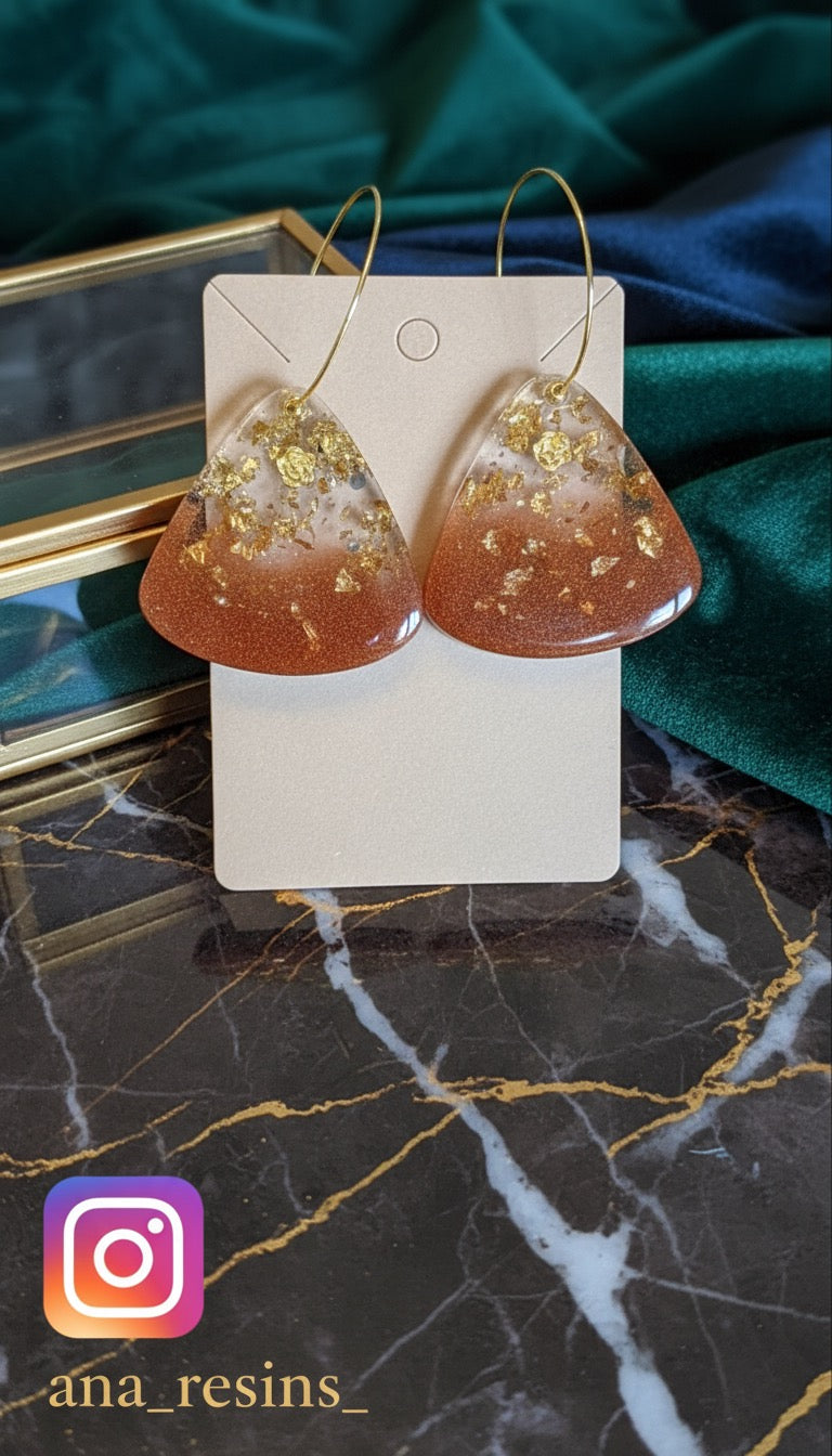 Handgjorda örhängen med bruna och detaljer guldfärgade.